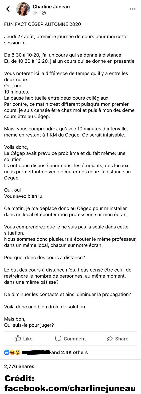 Une fille illustre la réalité de la rentrée scolaire au cégep aujourd’hui ConneriesQc 27 août 2020 Facebook Précédent Suivant Mis à jour le 27 août 2020 5:23 pm Facebook Précédent Suivant