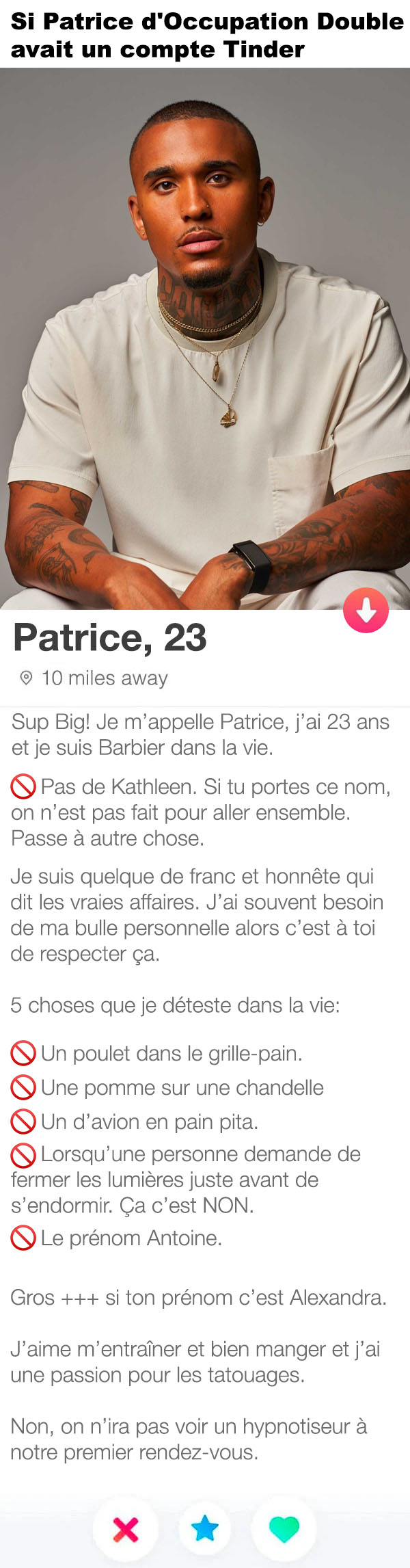 Si Patrice d’Occupation Double avait un compte Tinder ConneriesQc 12 octobre 2021 Facebook Précédent Suivant Mis à jour le 12 octobre 2021 10:48 am Facebook Précédent Suivant