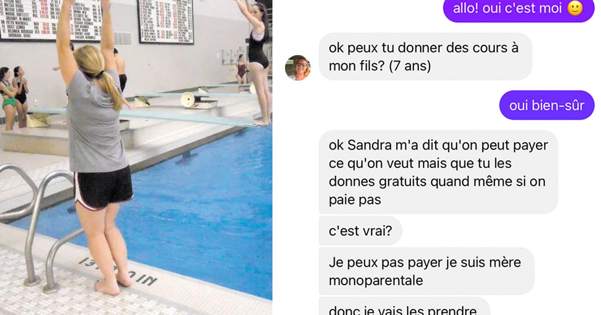 Une dame à la retraite donne des cours de natation gratuitement et se fait aborder par une maman assez intense