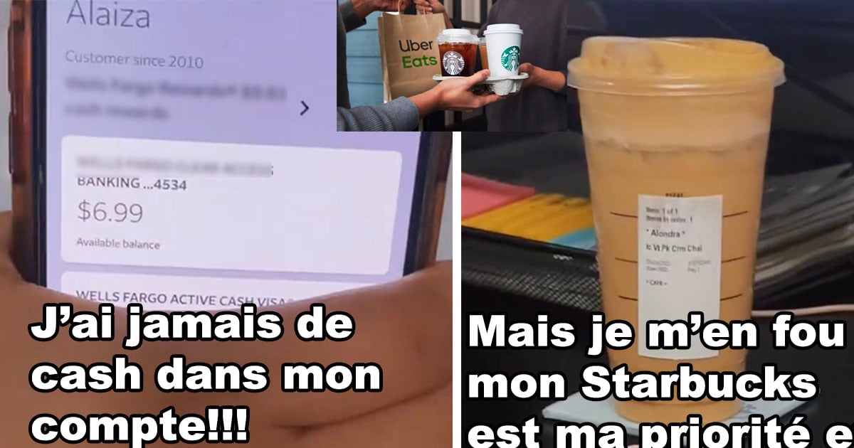 Sur cette photo, une fille montre fièrement son solde de 6.99$ tout en montrant le gros café glacé qu’elle vient de s’acheter au Starbucks… en passant par UberEats: