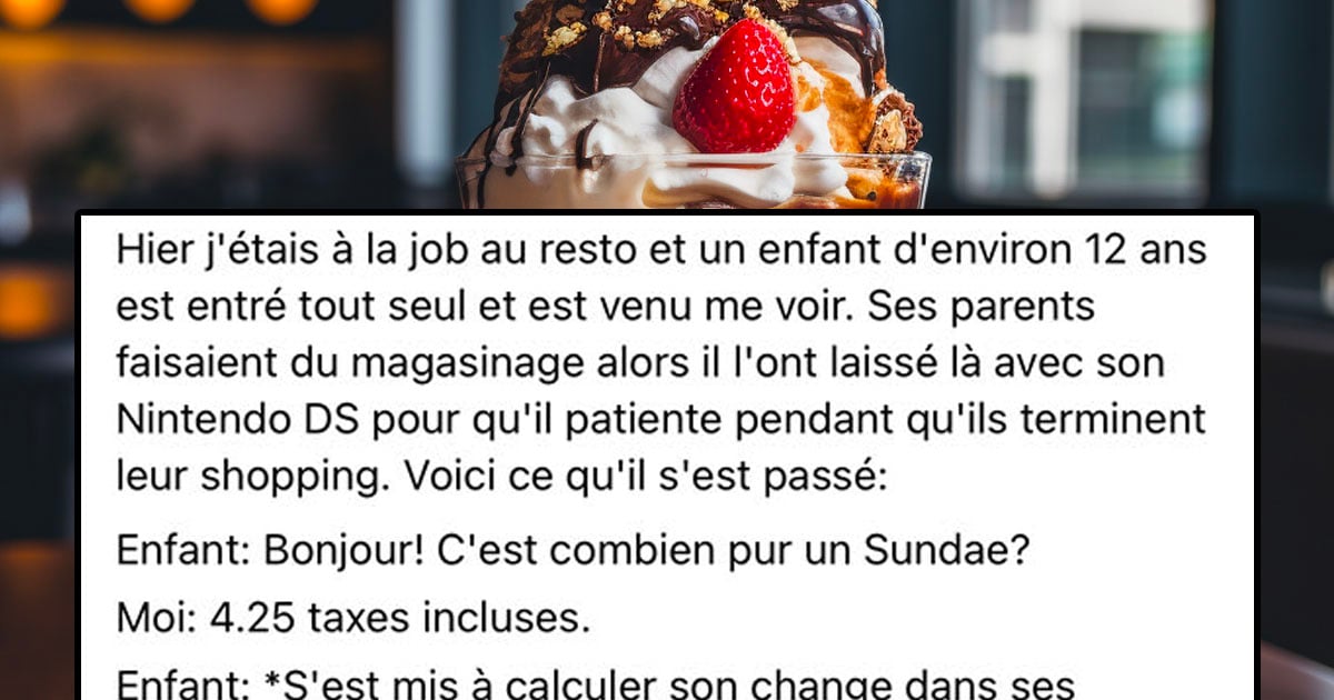 Hier j’étais à la job au resto et un enfant d’environ 12 ans est entré tout seul et est venu me voir. Ses parents faisaient du magasinage alors il l’ont laissé là avec son Nintendo DS pour qu’il patiente pendant qu’ils terminent leur shopping. Voici ce qu’il s’est passé: