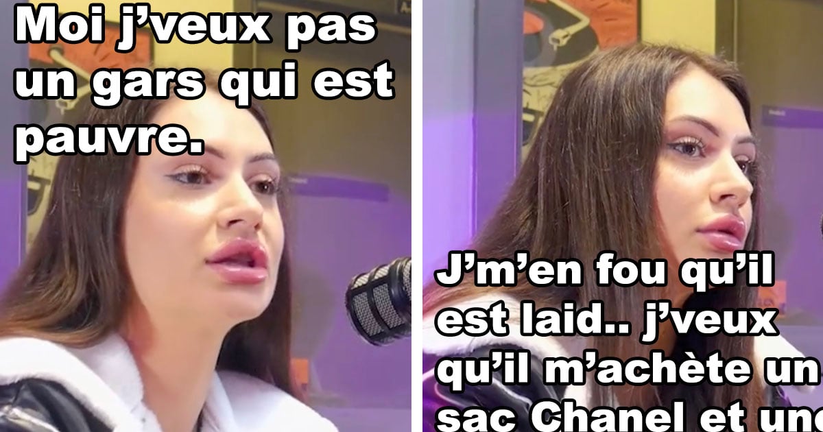 Je ne veux pas un gars qui est pauvre. Pour moi, être pauvre, c’est comme… T’as pas une grosse machine de luxe, t’as pas des gros montants dans ton compte de banque… Tu peux pas voyager comme quand tu veux. Comme moi. J’ai besoin d’un gars qui peut m’acheter un sac Chanel. Un Birkin.