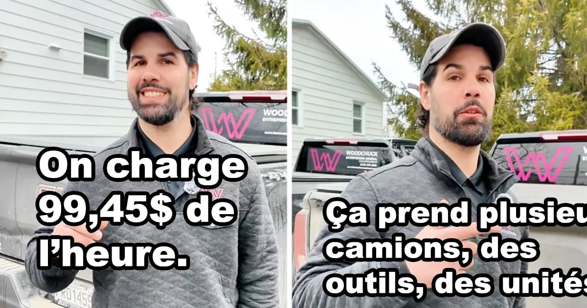 Voici @woodchuckinc sur TikTok. Ce représentant d’une entreprise québécoise de rénovation explique pourquoi le tarif horaire s’élève à 99,45 $, qui est composé d’un taux de base de 85,00 $ plus une surcharge de 17%.