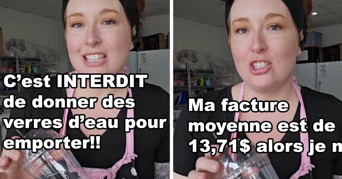 Voici @miss.macaron2021 sur TikTok. Cette restauratrice québécoise explique de manière transparente pourquoi elle ne peut pas offrir de verres d’eau à emporter dans son établissement.