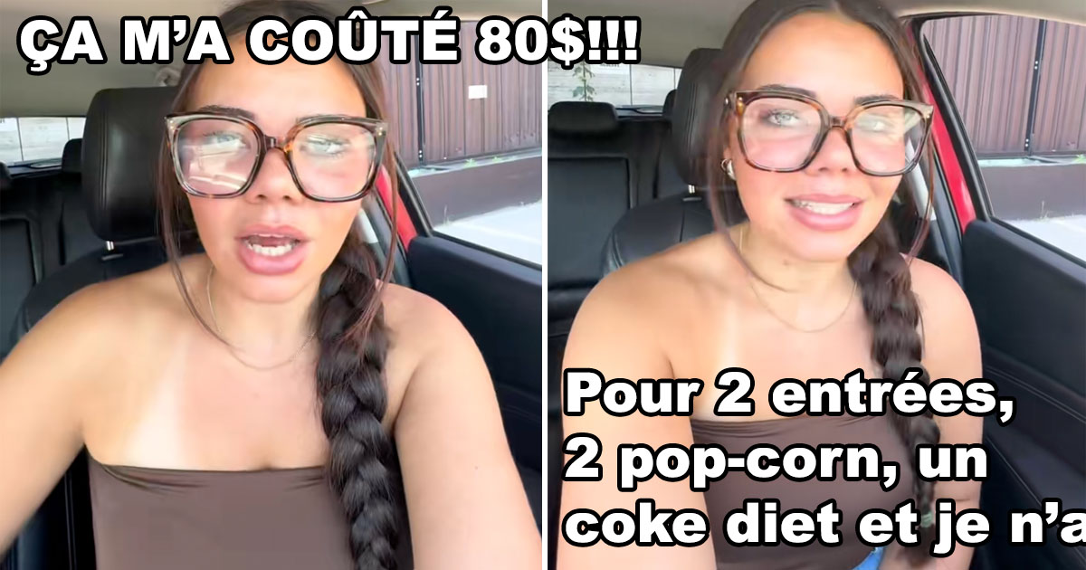 Cette Québécoise n’a pas mâché ses mots pour dénoncer le coût exorbitant d’une simple soirée cinéma : 80 $ pour deux billets, une boisson et un popcorn au format « ziploc ». Elle précise qu’elle n’a même pas opté pour le plus gros format, mais la facture, elle, est restée salée. (via PetitPetitGamin)