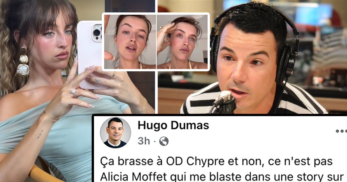 Au moment de partager sa chronique sur OD Chypre, Dumas écrit subtilement : « Ça brasse à OD Chypre et non, ce n’est pas Alicia Moffet qui me blaste dans une story sur Instagram. »