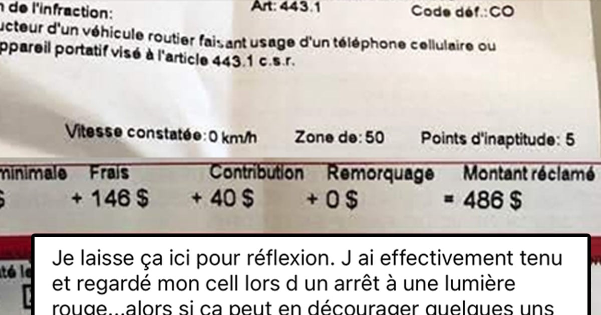 Johanne confie avoir reçu une contravention salée de 486 $ pour avoir simplement consulté son appareil alors qu’elle était arrêtée à un feu rouge. Elle publie son constat d’infraction en guise de réflexion, espérant que son expérience serve de leçon à d’autres automobilistes.