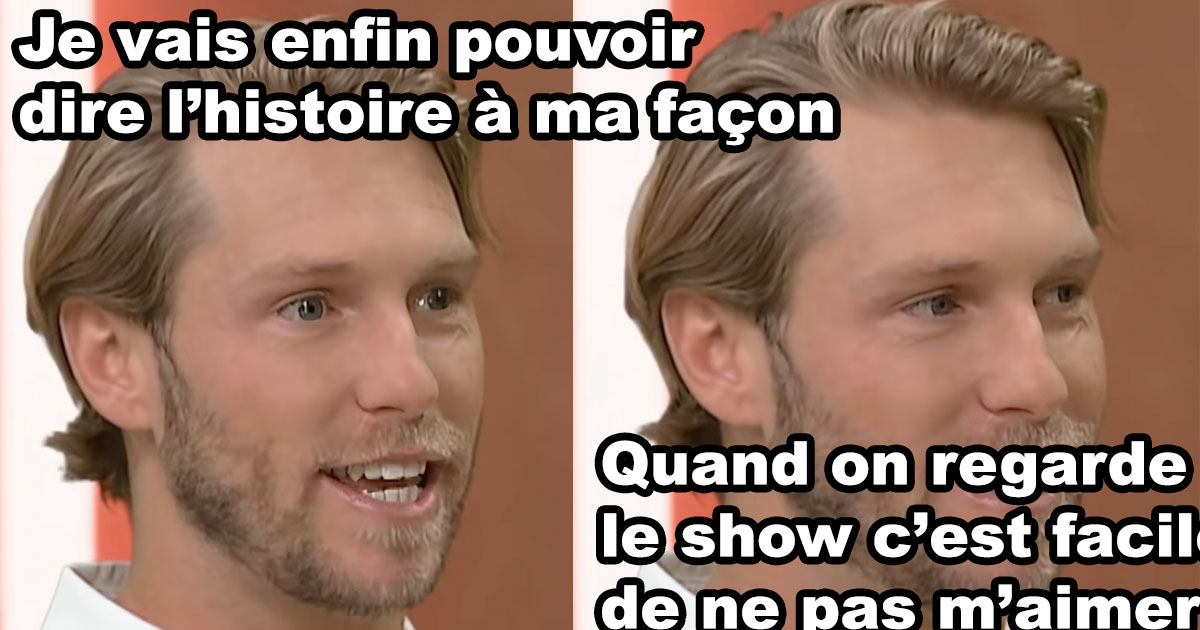 Il commence par reconnaître que ce que le public a vu n’est pas toujours représentatif de ce qu’il a réellement vécu : « Enfin, je vais pouvoir un peu dire l’histoire à ma façon, parce que vous avez vu les épisodes et que t’as l’impression que ton histoire, ce que toi t’as vécu, c’est pas nécessairement ce qui a été montré dans l’émission. »