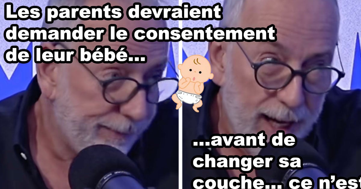 D’entrée de jeu, Dutrizac précise qu’il ne s’agit pas d’une blague : « Les parents devraient demander le consentement de leur bébé avant de changer sa couche. C’est pas une joke, c’est une vraie bulle. » Il met en lumière la logique des partisans de cette idée : se mettre à hauteur de l’enfant, lui expliquer en détail ce qu’on s’apprête à faire, attendre une réaction faciale ou un signe corporel de “consentement” avant de procéder.