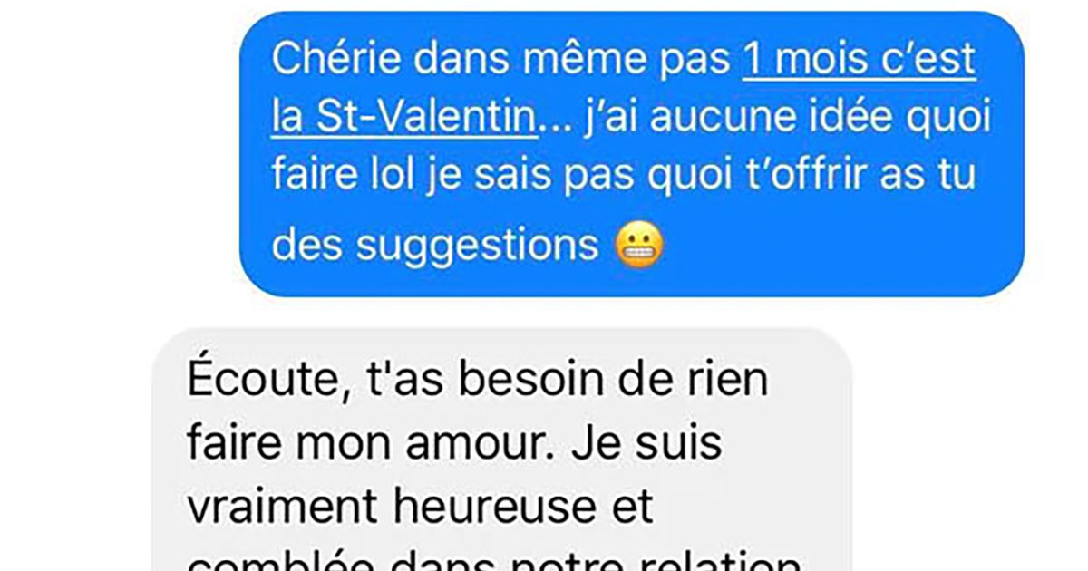 Au lieu de dresser une liste d’idées cadeaux, cette fille «parfaite» lui offre quelque chose de beaucoup plus puissant: la certitude qu’il est déjà suffisant. Sa seule «exigence» est de continuer d’être présent, fier d’elle, et de la faire sentir au cœur de son bonheur. La conversation se termine sur un «My god que je t’aime», comme une signature spontanée qui prouve qu’ils ont déjà tout ce dont la St‑Valentin devrait être le symbole. Dans un monde où l’on surconsomme même les émotions, cette histoire rappelle qu’un message honnête peut valoir bien plus qu’un bouquet de dernière minute.